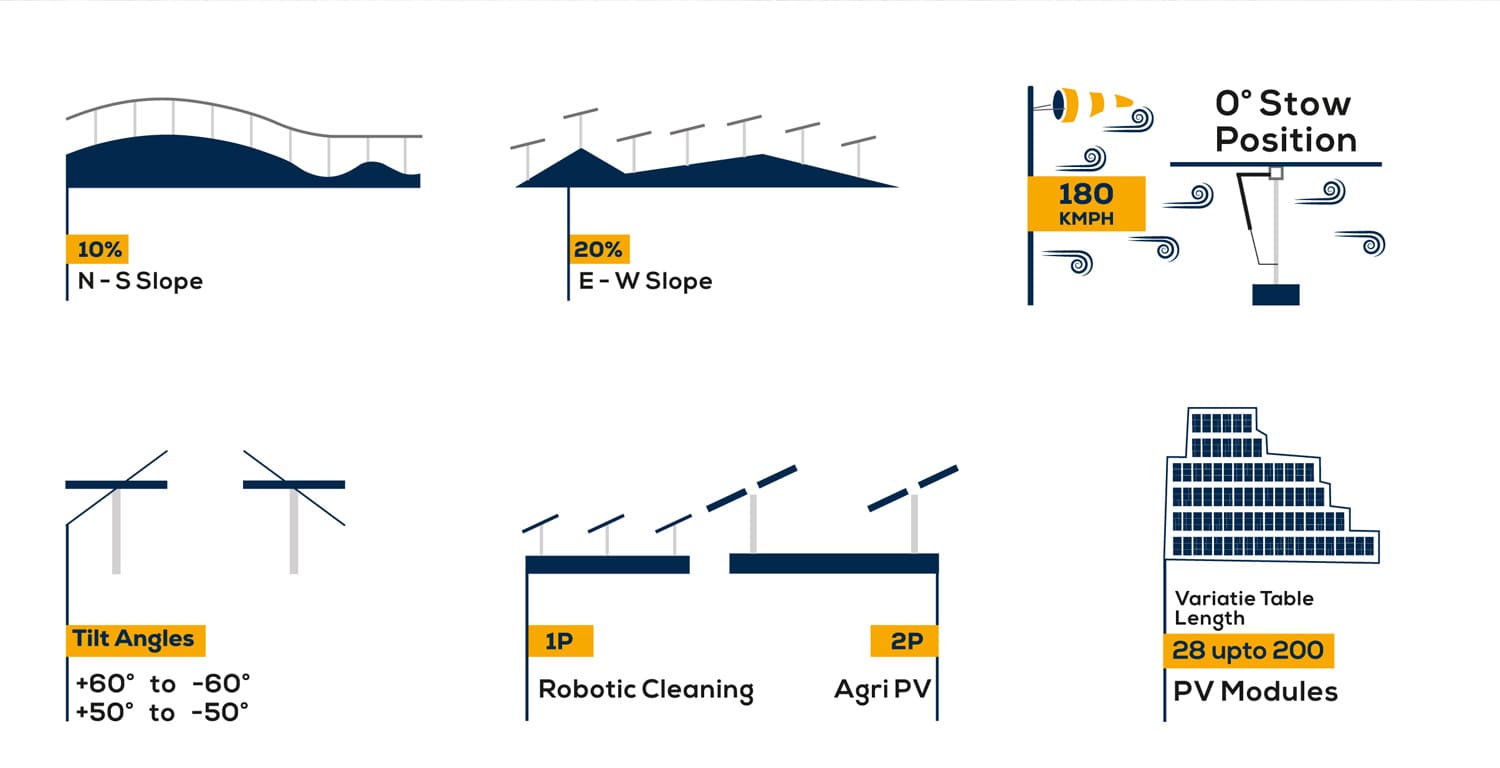 1P & 2P Tracker Designs Compatible with robotic cleaning systems (1P) and Agri-PV applications (2P), ensuring seamless integration with modern operational requirements. |