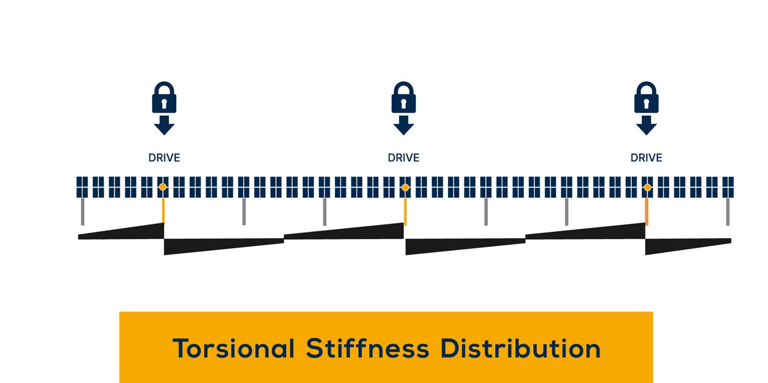The Multi-Drive & Torsional Lock system in Sunchaser’s Horizontal Single-Axis Solar Trackers (H-SAST) enhances stability, durability, and efficiency, ensuring maximum energy output and system reliability.