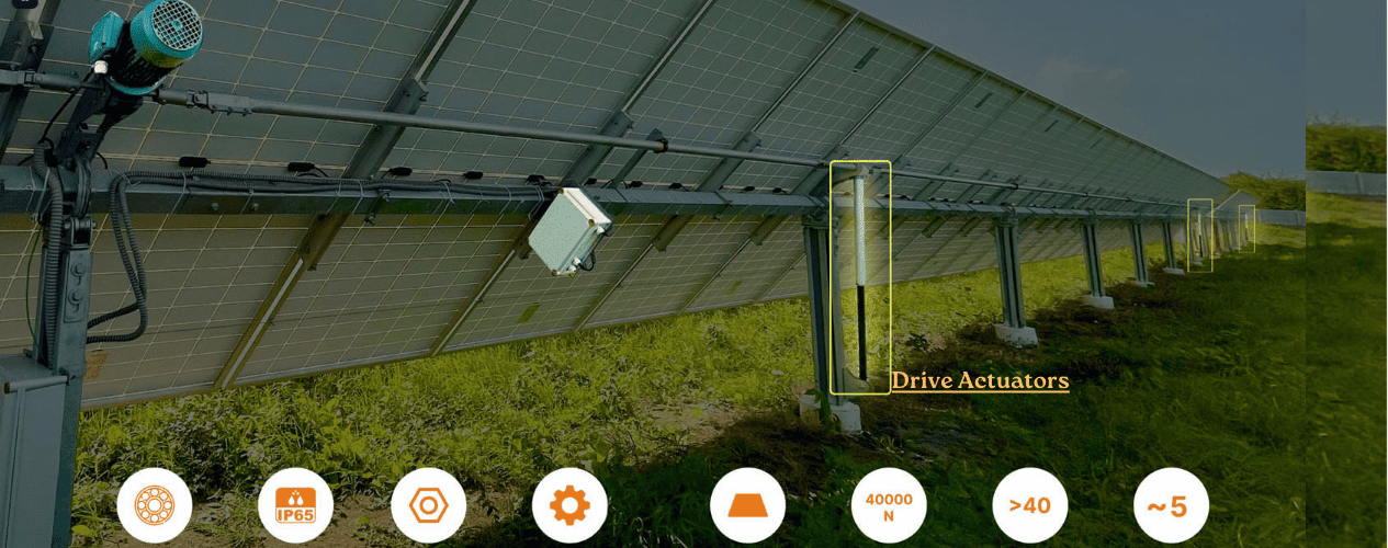 Stow Position: 0° | Wind Speed: Up to 180 KMPH The tracker includes an automated 0° stow strategy for extreme weather events, ensuring system safety in wind speeds up to 180 km/h. |