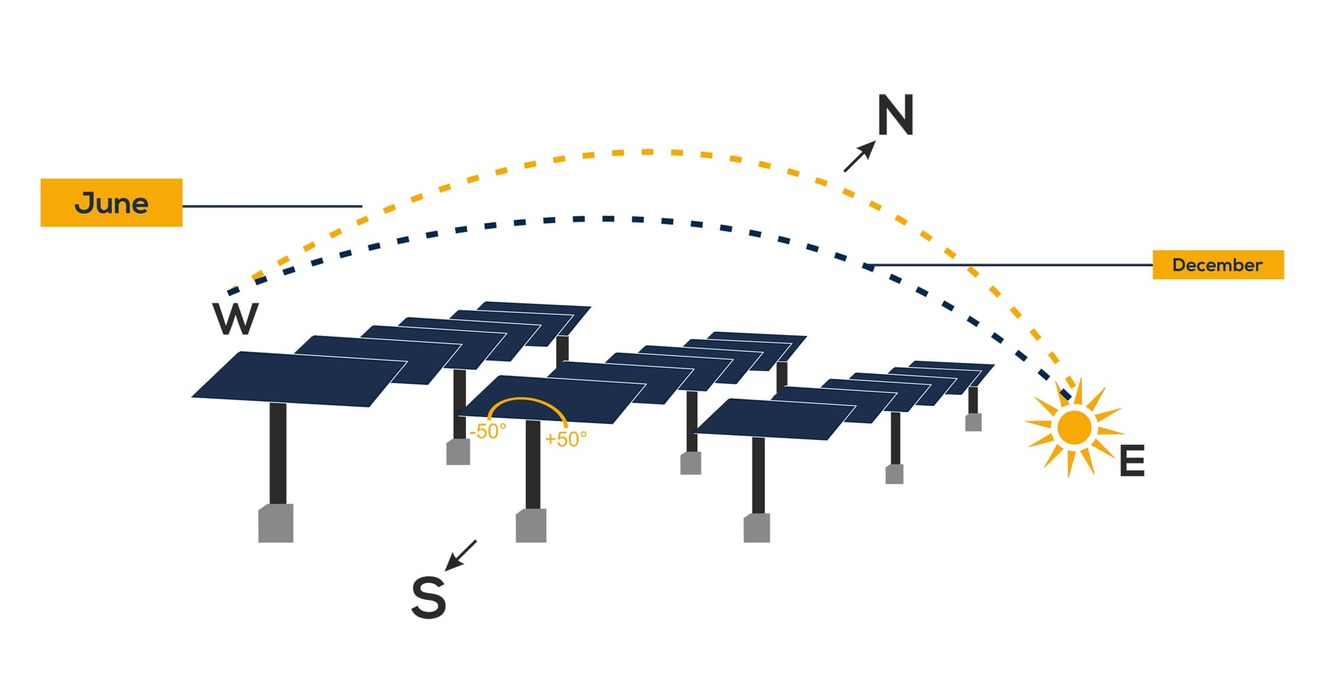 Permanently south-tilted modules at 10 mounted on an East-West Single-axis tracker bring together the advantages of fixed south tilt & day trackers